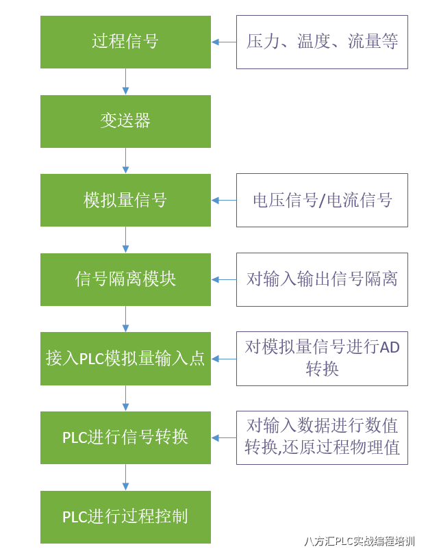 从以上PLC模拟量的信号输入流程可以看到,在自动化过程控制系统中,模拟量信号的输入是非常复杂的。但是,在现目前的工业现场,对模拟量信号的处理已基本都采用电流信号方式进行传输,相比于电压信号方式,电流信号抗干扰能力更强,传输距离更远,信号稳定。