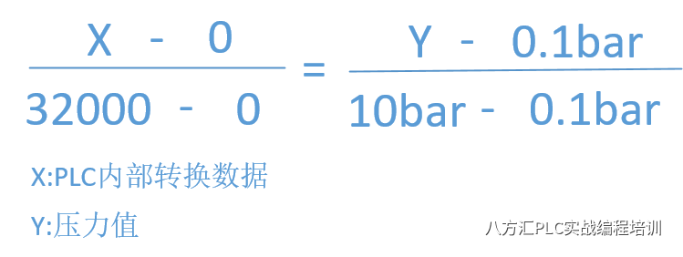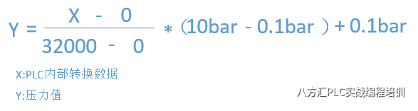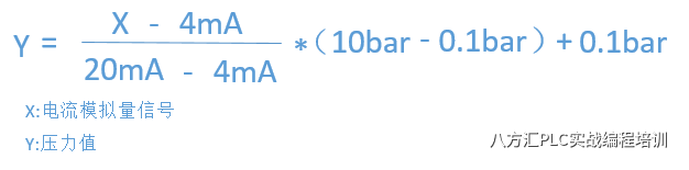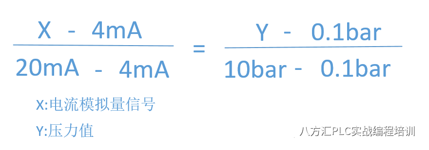 实际物理值与模拟量数据之间的转换方式同上面的转换方式相同。如下为某压力变送器的压力与模拟量信号范围(0.1-10bar,4-20mA),同样的,压力与电流之间有如下的转换关系公式:
